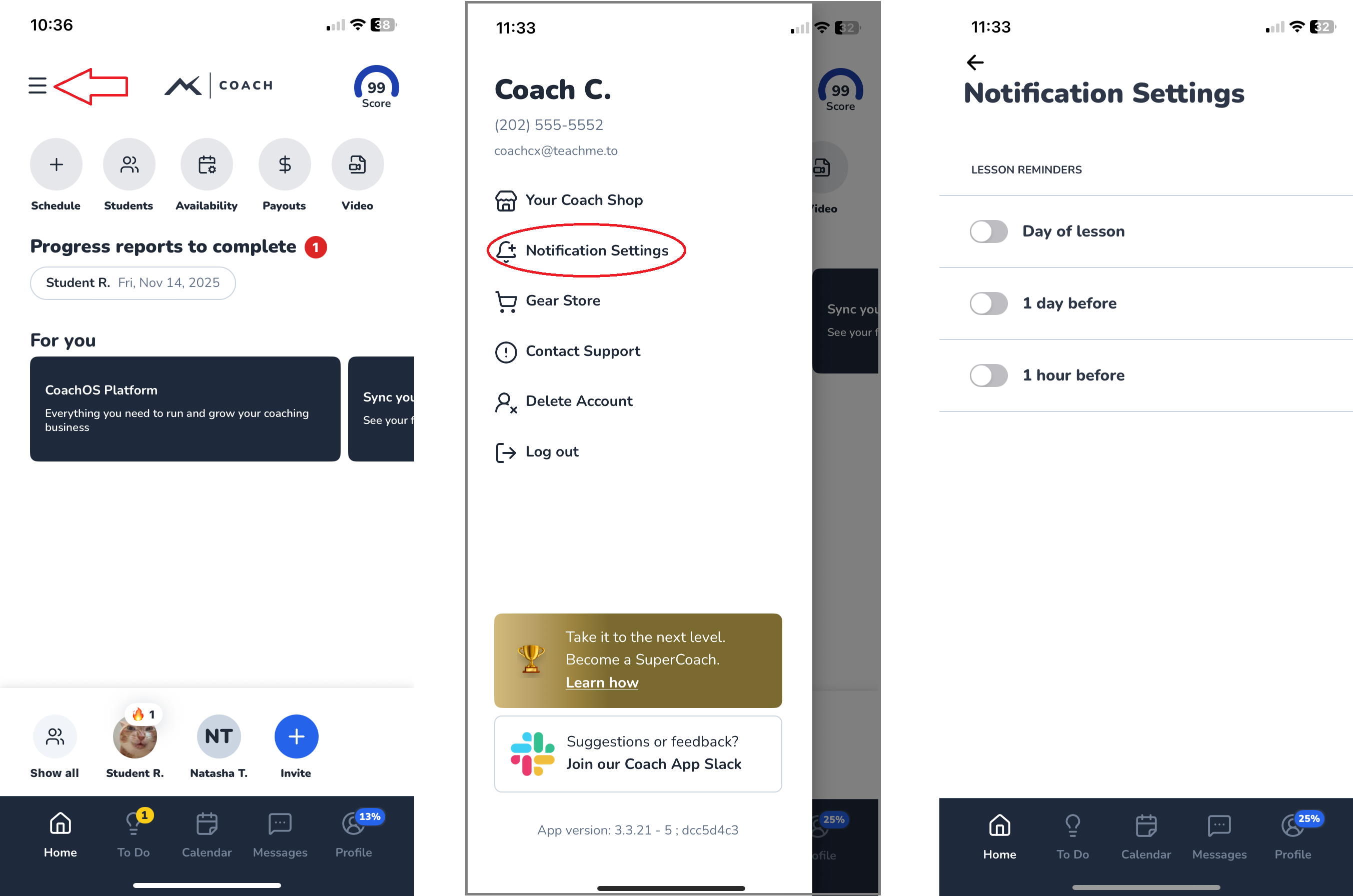 TeachMe.To coaches can customize lesson reminder notifications directly inside the Coach App. These reminders help you stay on top of upcoming lessons, but you can adjust their timing or turn them off whenever you like.
